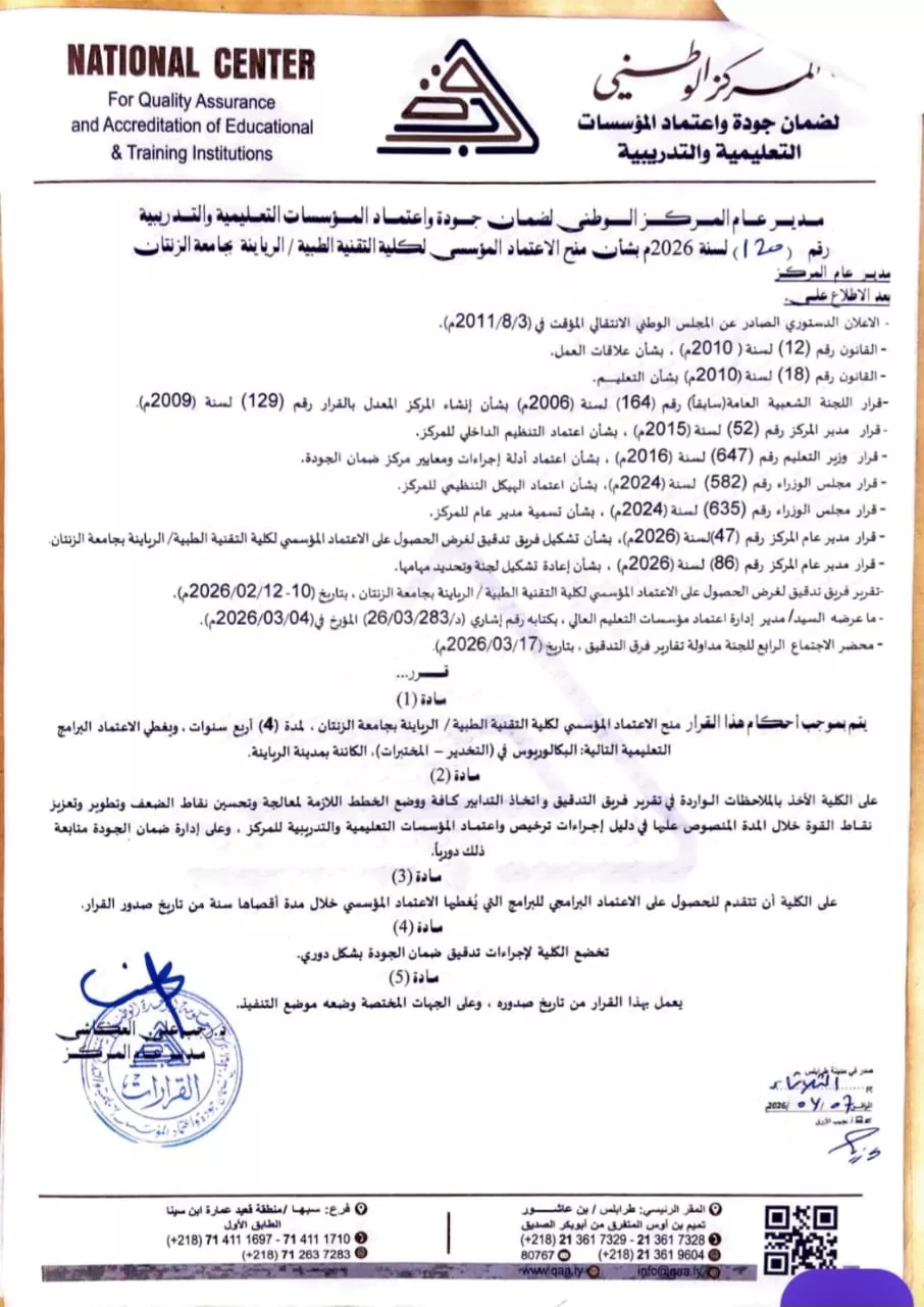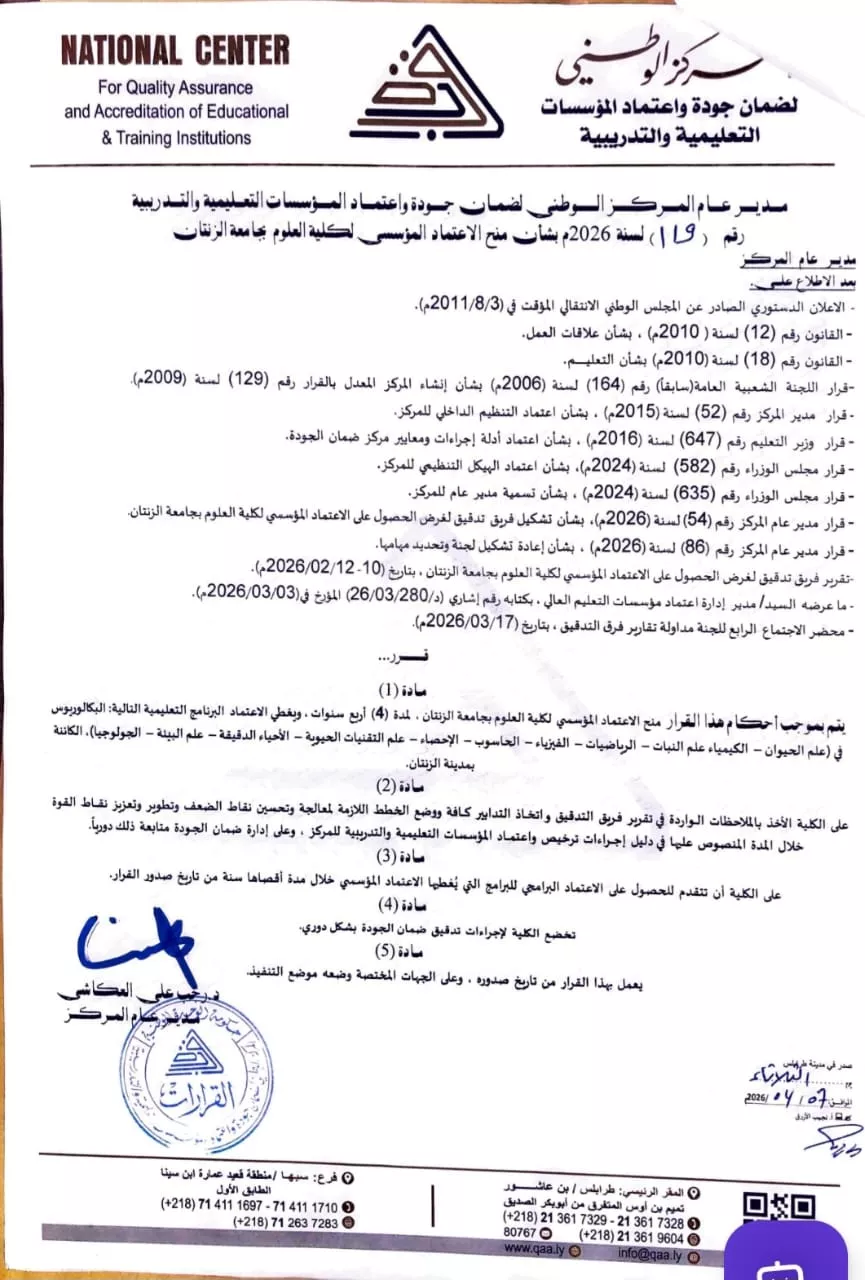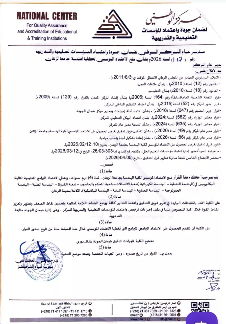 في إطار تنفيذ الخطة العلمية الاستراتيجية لجامعة الزنتان، التي ترتكز على ترسيخ معايير الجودة والاعتماد الأكاديمي للمؤسسات والبرامج التعليمية، .