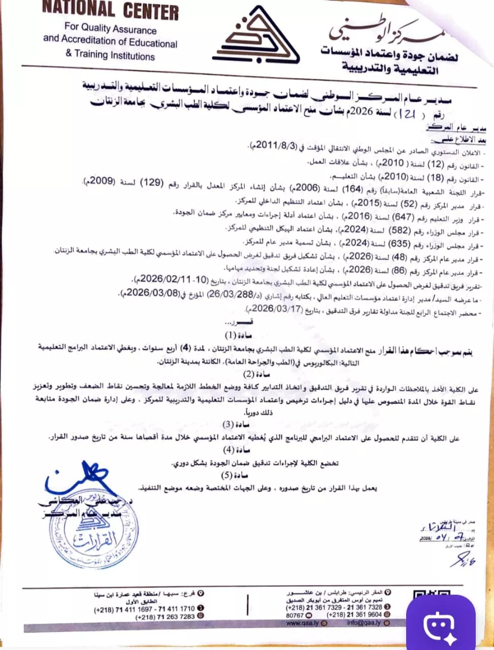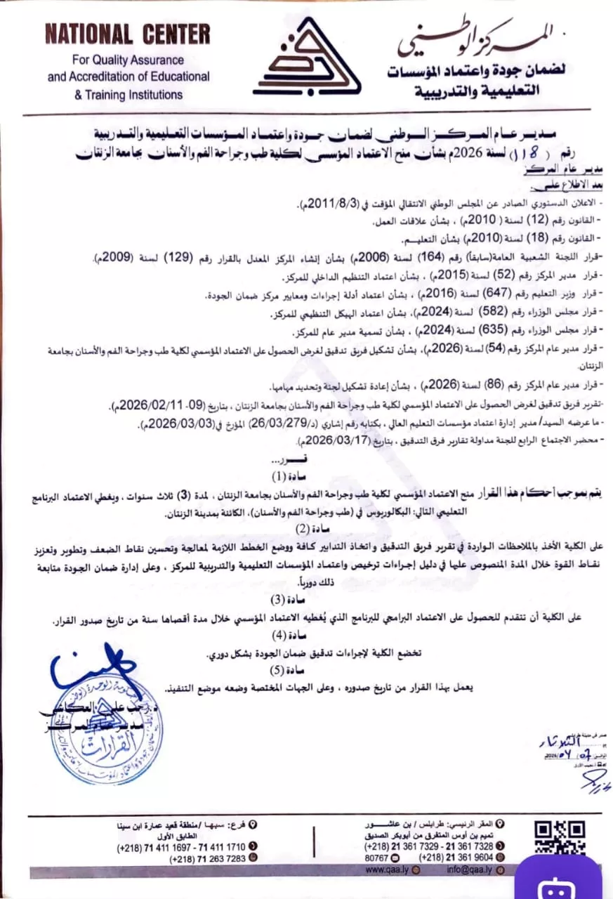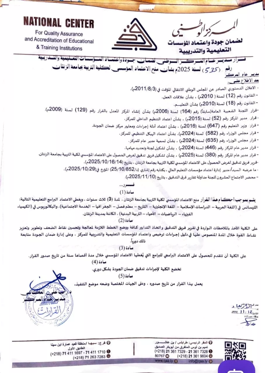في إطار تنفيذ الخطة العلمية الاستراتيجية لجامعة الزنتان، التي ترتكز على ترسيخ معايير الجودة والاعتماد الأكاديمي للمؤسسات والبرامج التعليمية، .